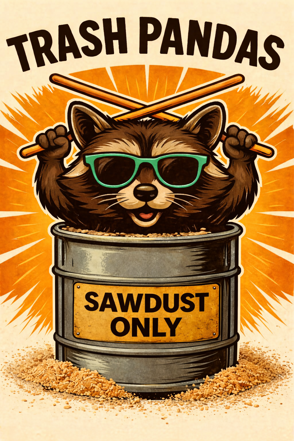 Trash Panda Drumsticks are our lovable B-stock misfits: fully playable, slightly scrappy, and proudly unconcerned with looking fancy. Expect cosmetic quirks, mixed grain vibes, and a general "I've seen some things" energy—because these are not weight-sorted, tone-sorted, or paired. You're basically adopting a handful of perfectly functional gremlins that just didn't make the prom court. 10 pairs for $50 ($5/pair)—ideal for practice, rehearsal, backups, and any situation where sticks are more a consumable tools than a cherished artifact.